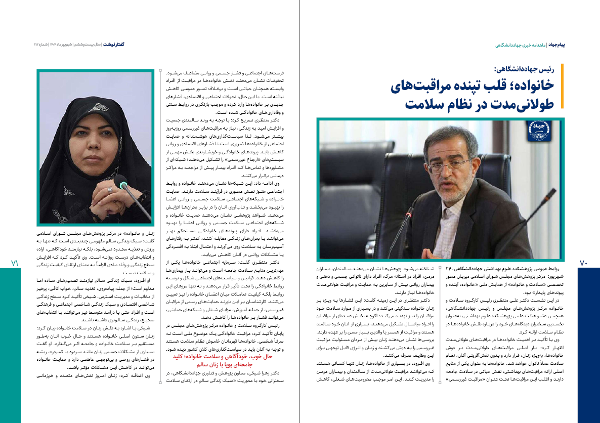 از جمله مطالب این شماره میتوان به روایت دو دیدار ماندگار رهبر انقلاب با جهادگران جهاددانشگاهی، توسعه همکاری های جهاددانشگاهی با مراکز درمانی عراق، واگذاری مسئولیت ملی نظارت و پیشبرد برنامه های کلان حوزه انیمیشن و بازی به جهاددانشگاهی، «درخت اجتماعی سلامت»؛ مدلی نوین برای ترسیم ابعاد چندگانه سلامت، تازهترین نتایج نظرسنجی ایسپا درباره مصرف شبکههای اجتماعی و استفاده از ابزارهای هوش مصنوعی، تبدیل یافتههای پژوهشی به محصولات درمانی؛ رویکرد جهاددانشگاهی در پزشکی بازساختی، پرورش دانشجویان و حمایت از جوانان محور فعالیتهای پارکهای علم و فناوری جهاددانشگاهی، جهاددانشگاهی به استقبال از دانشجویان جدیدالورود میرود، امضای تفاهمنامه همکاری جهاددانشگاهی و مرکز مطالعات و همکاریهای علمی بینالمللی وزارت علوم، خانواده؛ قلب تپنده مراقبتهای طولانیمدت در نظام سلامت و ... اشاره کرد.